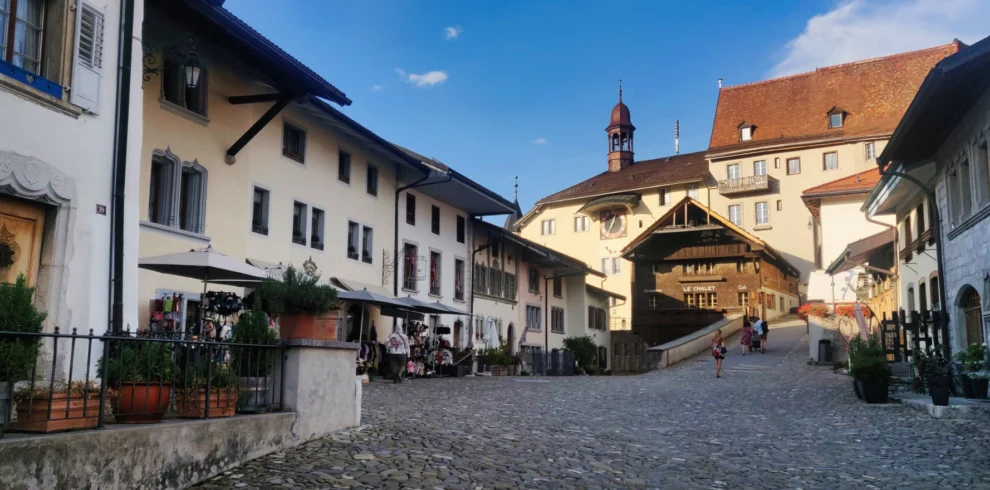 Gruyères is a picturesque medieval village in the canton of Fribourg, famous for its beautifully preserved old town and the hilltop Gruyères Castle overlooking the region. It is internationally known for Gruyère cheese, whose traditional production can be experienced at La Maison du Gruyère, and for world-class Swiss chocolate at the nearby Maison Cailler in Broc.